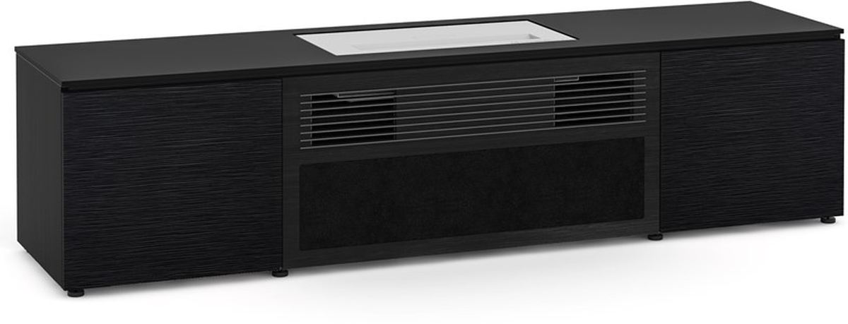 Black Oak finish with Tall Grass Texture and solid surface, black top. A simple installation with no need to open the wall or ceiling to run cables. All supporting components including a speaker system can be enclosed in the credenza to provide a beautiful and simple solution. Flush top surface, recessed projector cavity design, extruded aluminum frame creates a support skeleton, pinch-out rear panels to permit fast, easy access to components and wiring, built-in Louvers for better airflow to keep equipment cool. All supporting components including a speaker system can be enclosed in the credenza to provide a beautiful and simple solution. IR Repeater System required to control projector, wide variety of bolt-on options and accessories are available.